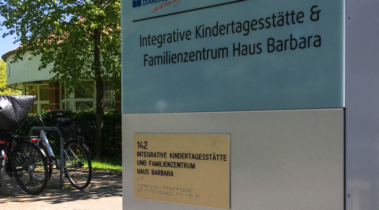 Einsatz von taktilen Elementen für die Wegeführung auf dem Boden oder durch Braille-Schriftelemente an den Informationsschildern.