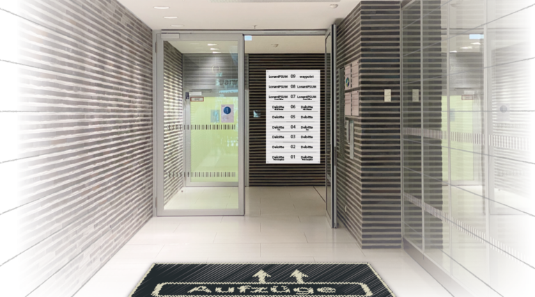 Für Ihr Orientierungssystem stellen wir Ihnen vielfältige Varianten zur Auswahl: An der Wand oder Außenfassade, von der Decke hängend, als Stele und auch beschriftetem Teppich u.v.a.m.