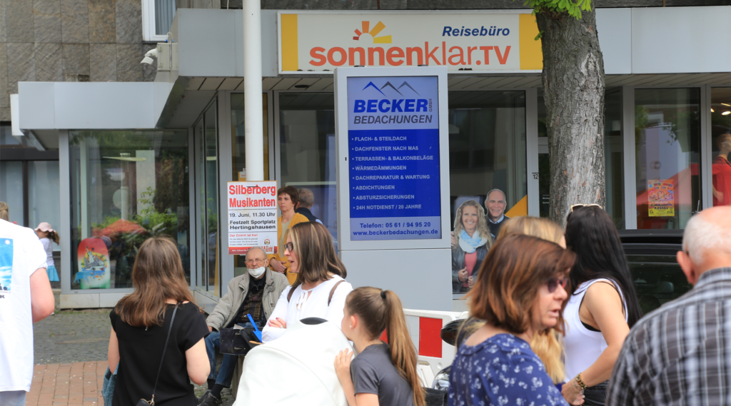 Eingesetzt werden in diesem Anwendungsbereich Displays mit outdoorfähigen Monitoren un einer Bildschirmdiagonalen von 55″, 75″ oder 85″.