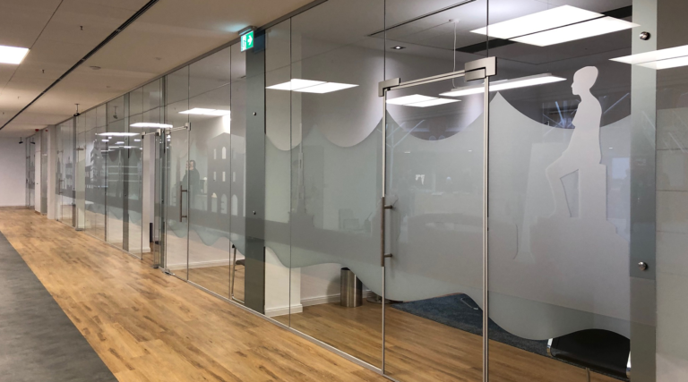 Sichtschutz durch Glasetched-Folien. Schlicht und Funktional oder mit CI-bezogenen Motiven